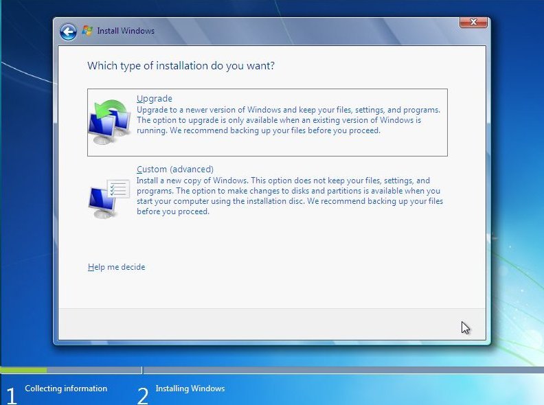Now the "Type of installation". Click on "Custom (Advanced) to continue the reinstall..