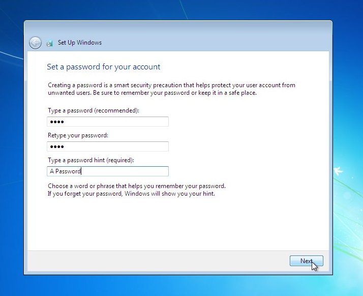 ....fill in the password box, retype to confirm, and leave yourself a hint incase it become forgotten. Click "Next to continue.
