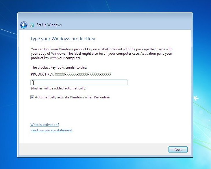 Input key (Dashes will be added automatically), "Automatically activate Windows when online" option is selected by default, deselect if you wish, and then click next to continue.