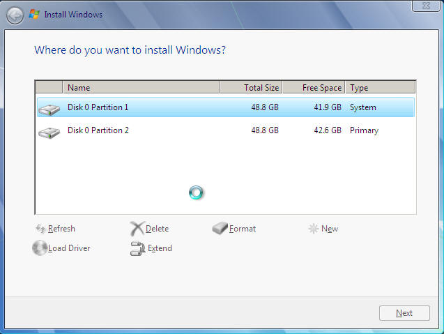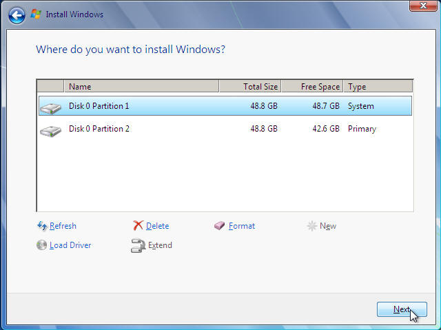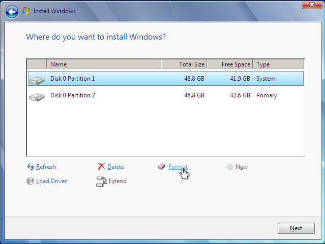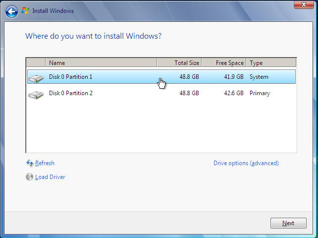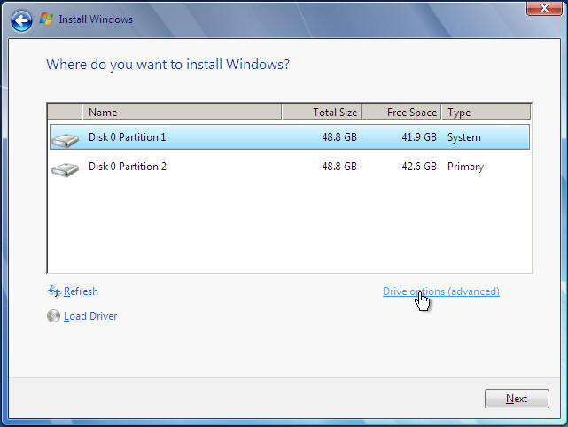 Drive Options Menu: Click "Next" to continue the install on your freshly erased (Formated) Partition (Hard drive)
